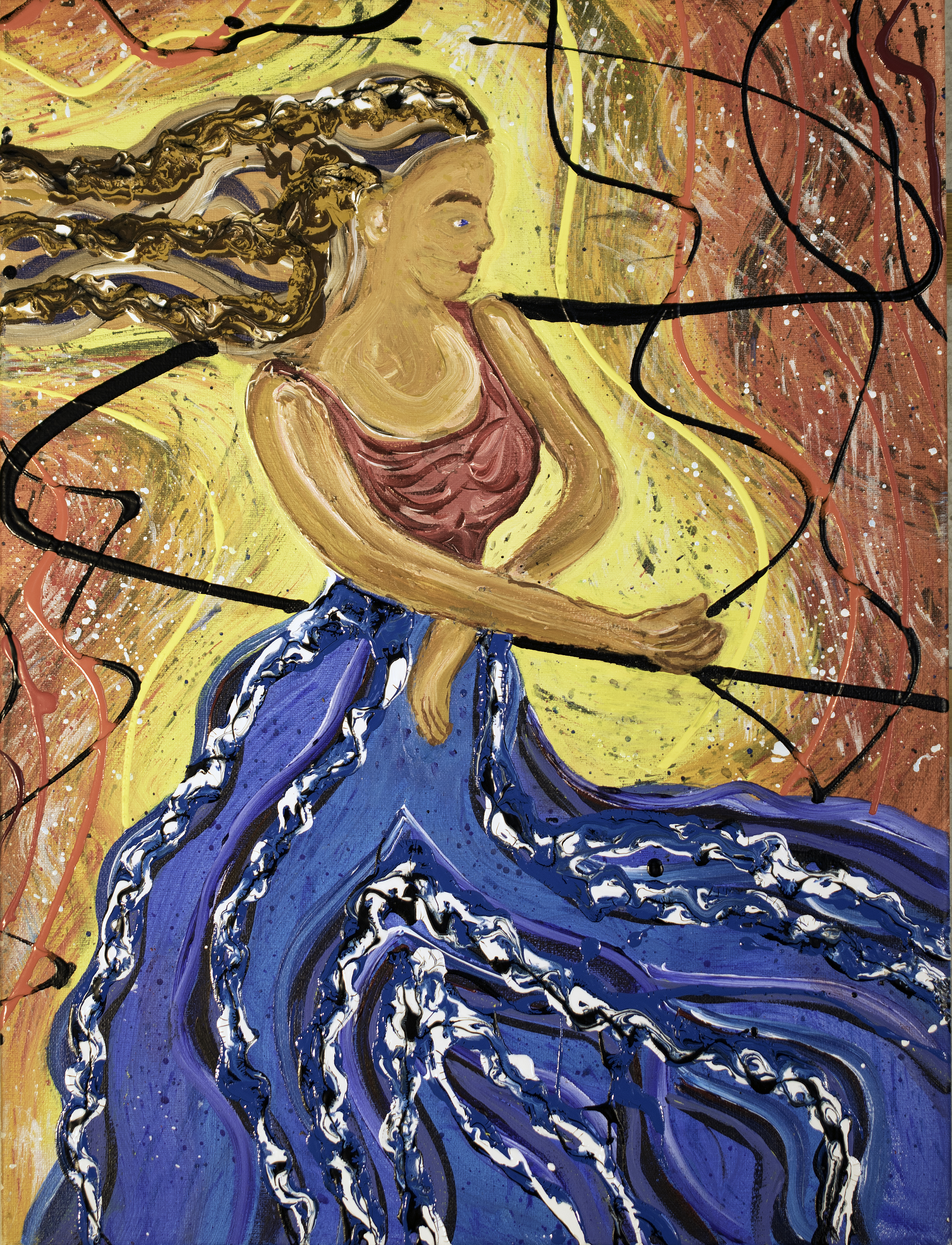 This entry was posted in Painting and tagged abstract art, acrylic, blue dress, cavalier, contemporary, dancer, expressionism, flamenco, fluid, hair, liquid, painting, sunburst, waves. Bookmark the permalink.